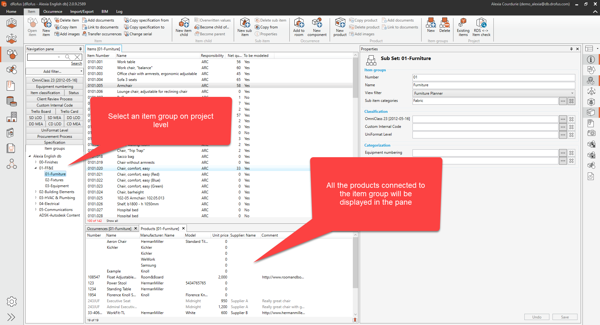 例えば、もしアイテムグループ全体で作成されたすべての製品を表示したい場合、ナビゲーションパネルでアイテムグループを選択し、