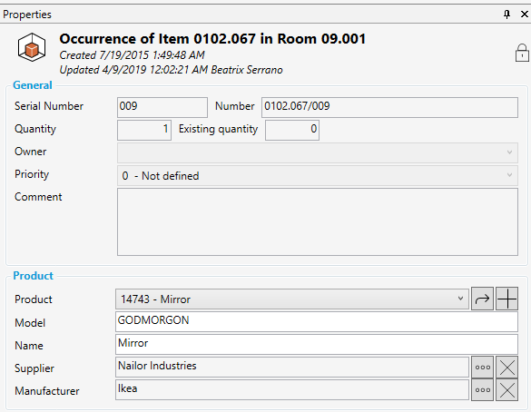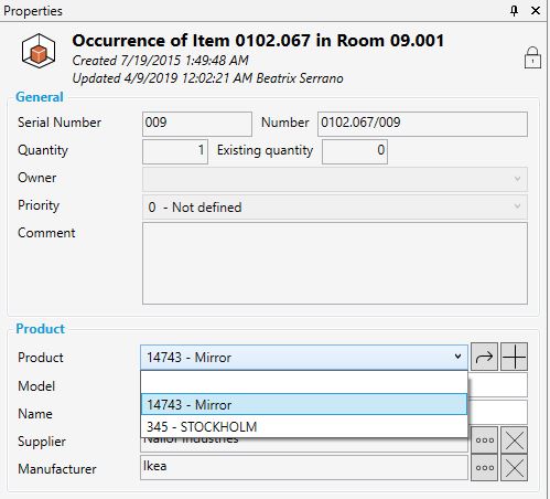 オカレンスプロパティパネルからオカレンスデータを編集するときに、製品の製品データプロパティを編集することができます。