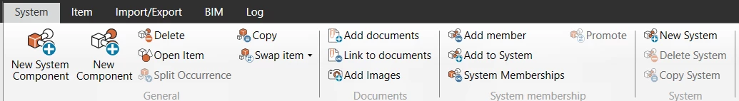 新規システム・コンポーネント | 選択したアイテムグループまたは分類に基づいて、新しいシステムコンポーネントを作成します。このオプションは、選択したアイテムグループまたは分類の下にレベルがない場合にのみ使用できます。 |