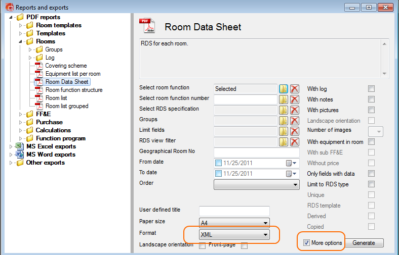 XMLファイル内のデータがそのプロジェクトに特有である可能性があるため、dRofusから生成することが有益です。dRofusの "Reports and exports (リポートとエクスポート)"から、