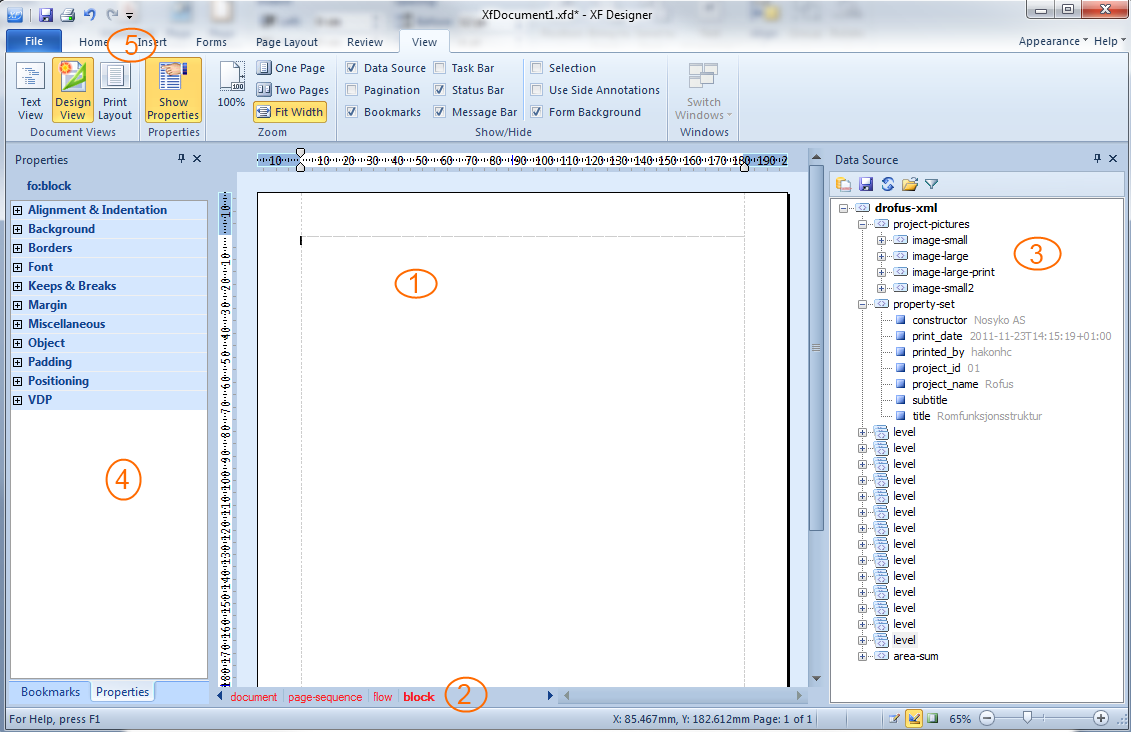 これで、データソース(3)からドキュメント/ページ(1)にデータをドラッグ&ドロップすることで、レポートの作成を開始できます。