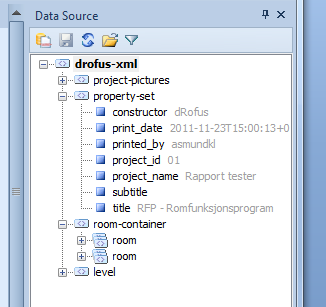 レポートをPublisherで作成する場合、最初に行わなければならないことは、データ・ソースを割り当てることです。データソースはdRofusのデータを含むXMLファイルです。