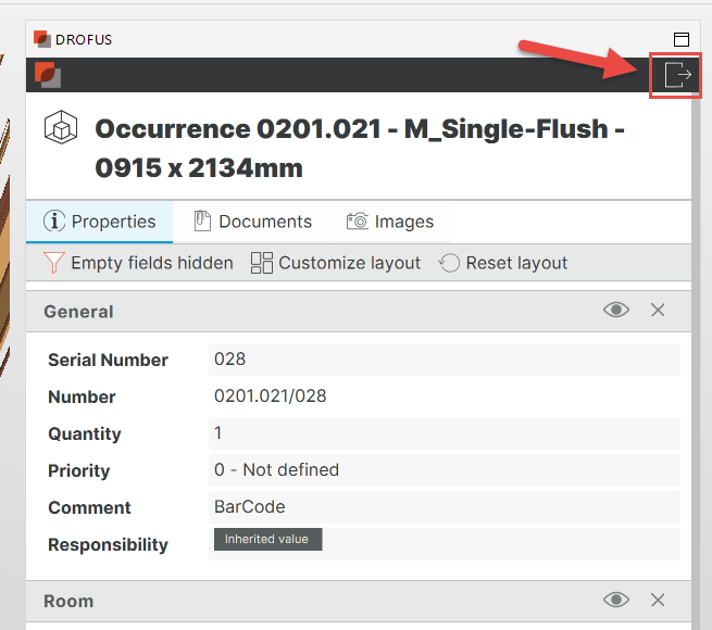 ログインした後、モデル内のオブジェクトを選択します。オブジェクトがリンクされている場合、dRofusパネルにdRofusに保存されているオカレンスに関するすべてのプロパティが表示されます。