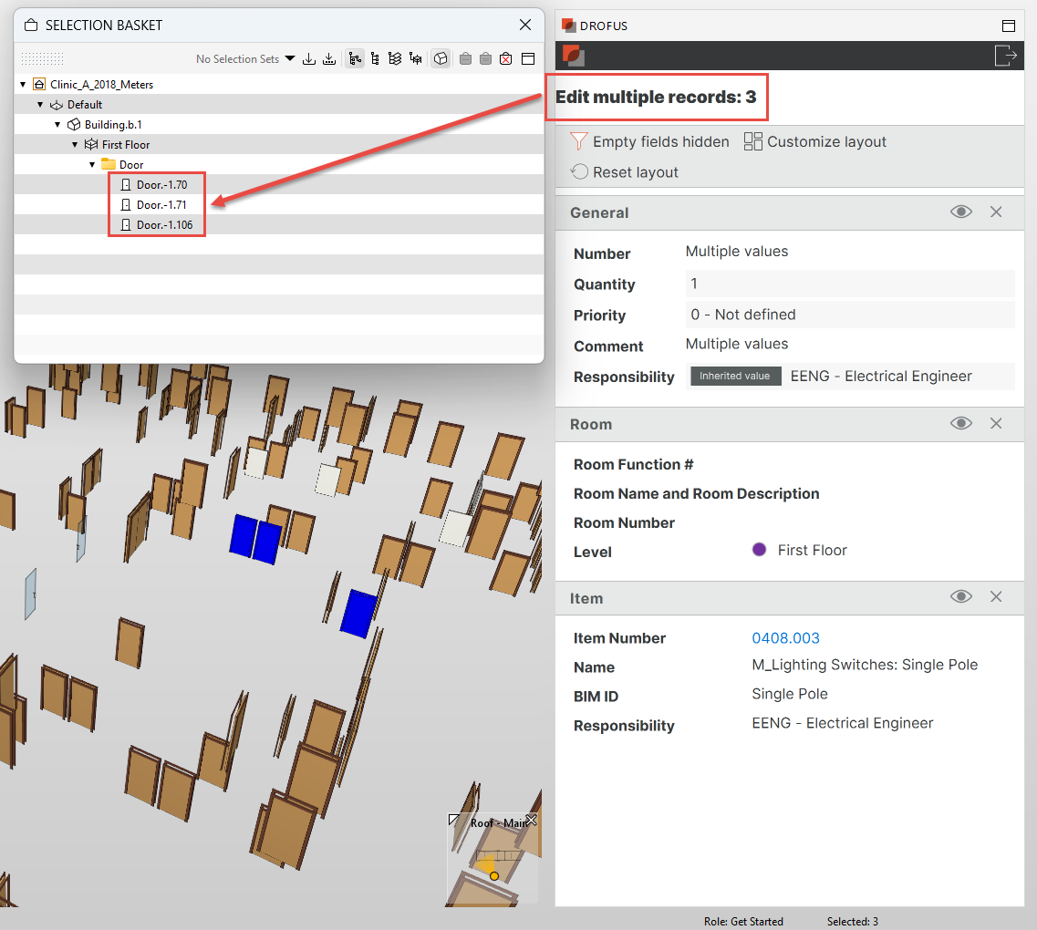 複数のオブジェクトが選択されている場合は、Solibri Selectモードまたは選択バスケットを使用して、dRofusプロパティパネルに、選択されたリンクオブジェクトの数量に関する情報が表示されます ;