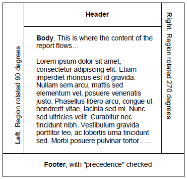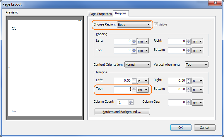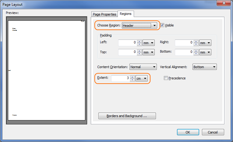 重要:本文領域 (レポートのメインコンテンツが追加される部分) にはサイズはありませんが (ページにはあります)、マージンとパディングがあります。マージンは、ページサイズから本文までの余白の合計です。例えば、ヘッダーの高さを3cmにしたい場合 (範囲)、ヘッダーの範囲を設定し、本文の上マージンを少なくとも3cmにする必要があります。