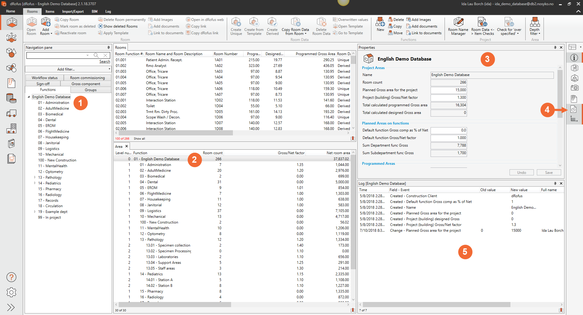 プロジェクトログを表示するには、部屋モジュールに移動し、機能構造の最上位(トップ)レベル(1)、またはエリアパネルの最上位(プロジェクト)レベルを選択します(2)。