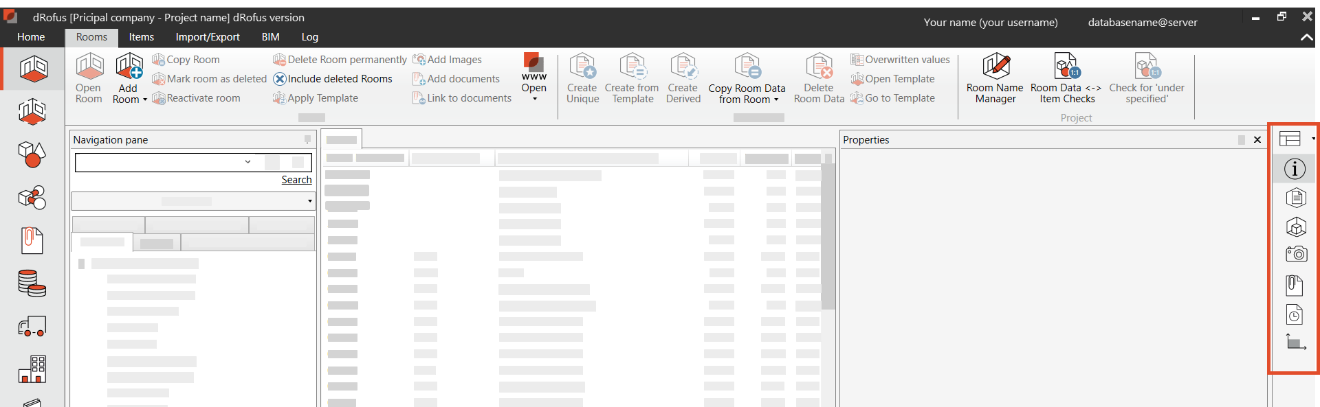 パネルは、モジュール を開くと右側に表示されます (例:部屋やアイテムモジュール)。