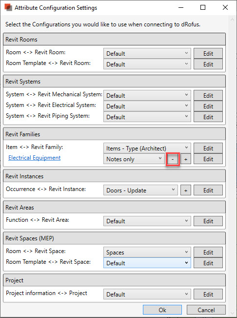 次に “ファミリタイプ<->dRofusアイテム (Family Type <-> dRofus Item)”ウィンドウを開くと、有効な構成の横に “++” マークが表示され、同期を実行した場合に1つまたは複数のサブ構成が適用される可能性があることがわかります: