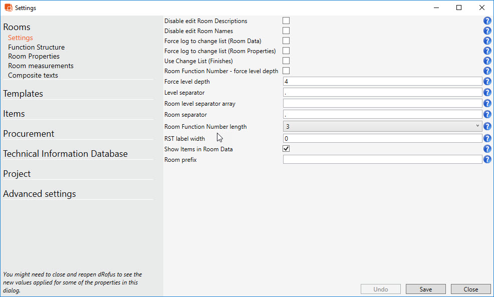 オプションを変更すると、dRofus でのデータ生成の動作に影響しますのでご注意ください。例えば、Rooms→Settings (部屋->設定)で