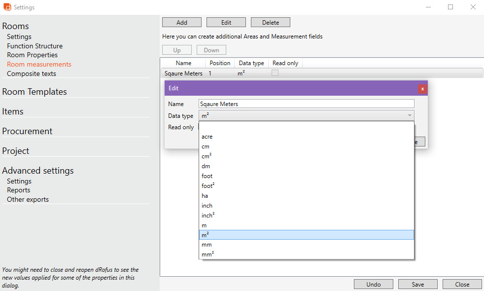 部屋測定を追加する際、部屋測定 (Room Measurement)に関連付けられる測定単位としてデータ型を追加することができます。