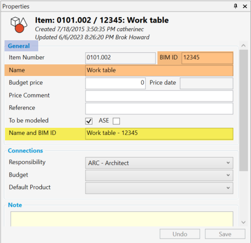 次に、'BIM ID'と'Name'(オレンジ色でハイライト)の値は、新しい属性'Name - BIM ID'(黄色でハイライト)の複合テキスト属性で結合されています。