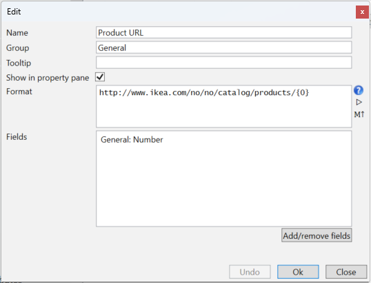 フィールド・オプションには、IKEAの製品へのURLの静的な部分 (黄色のハイライト)を単純に貼り付けました。