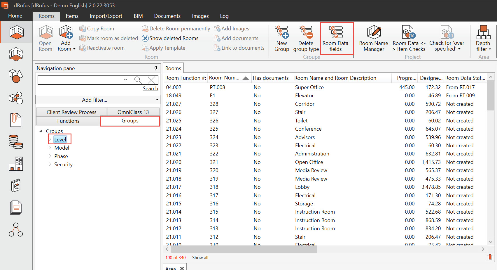 部屋モジュールからこの機能にアクセスするには、部屋データフィールドを表示するためにグループタイプを選択する必要があります。
