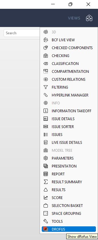 SolibriでdRofusプロパティパネルの利用を開始するには、接続したいdRofusデータベースにログインする必要があります。Solibri モデルウィンドウの右上にあるViewsオプションを選択し、DROFUSを選択します ;