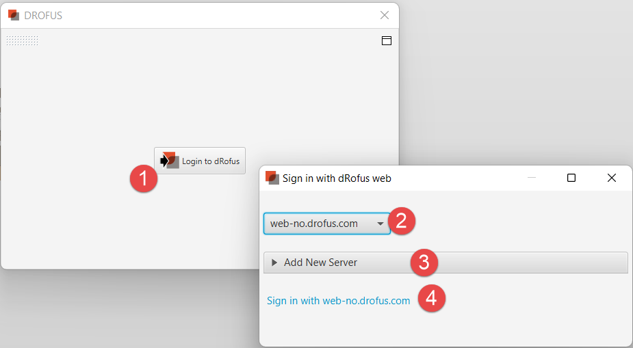 DROFUSオプションを選択すると、dRofusのプロパティパネルが開き、dRofusにログインするよう促されます。