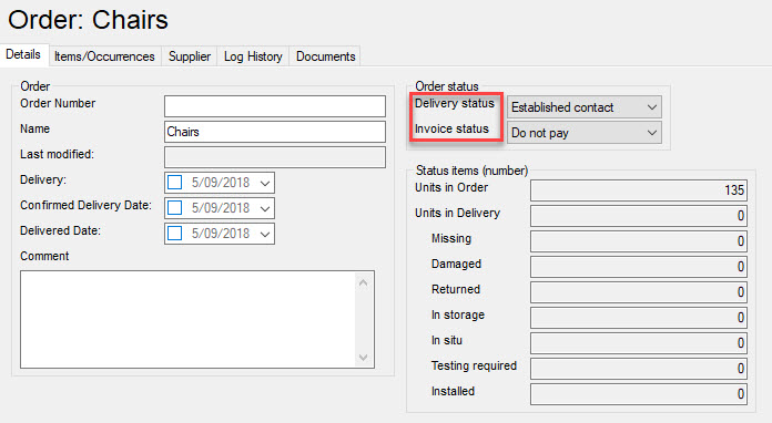 以下の例では、"Delivery Status (納品ステータス)" 納品ステータスと、"Invoice Status (請求書ステータス)"の2つのステータスがあります: