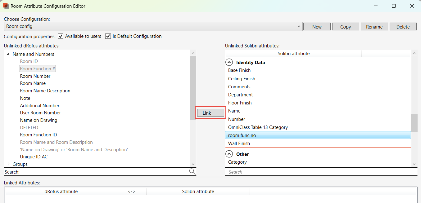 マッチングに使用する新しいキー属性を設定するには、リンクされていないdRofus属性とリンクされていないSolibri属性を選択し、Link==をクリックします。