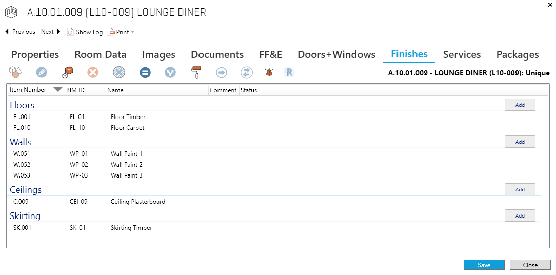 dRofusでは、計画された仕上げアイテムは直接部屋に関連付けられます。計画的な仕上げが完了したら、仕上げリストのアイテムをRevitの部屋パラメータに同期させることができます。