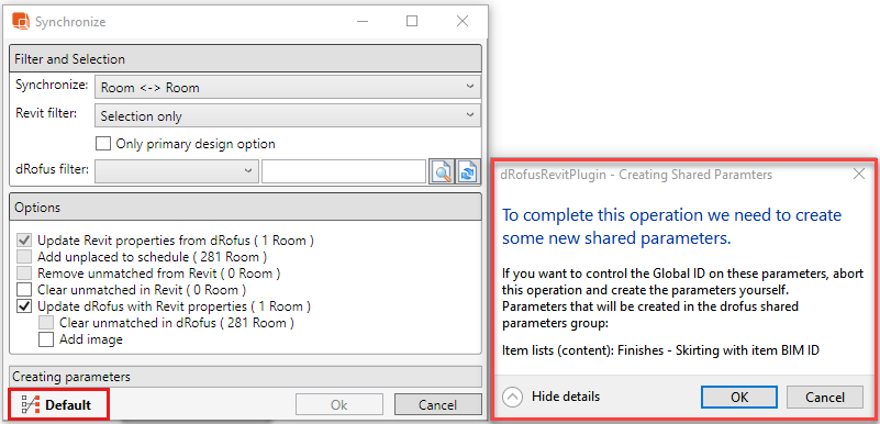 上記の部屋構成(“Revit 部屋 - 仕上げ”)を使用して部屋を同期する場合、新しい共有パラメーターの作成を確認するよう求められます: