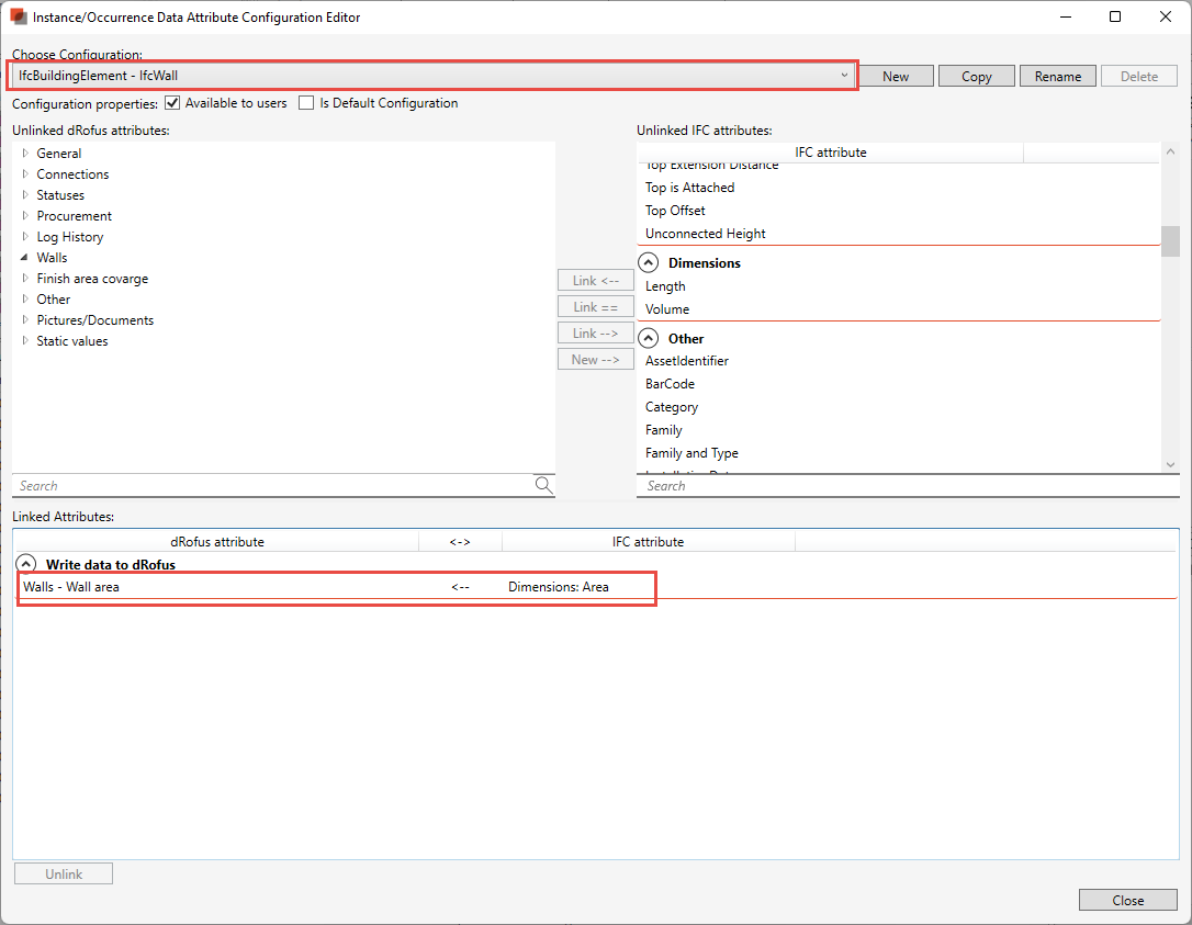 (メインの “オカレンス <-> IFCオカレンス” 構成にはすでに設定されています) 、どちらか一方のプロパティを選択し、プロパティの値を移動する方向を選択します。