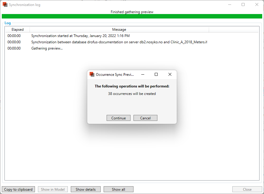 同期操作を開始すると、まず、作成されるオカレンスの数と削除されるオカレンスの数のプレビューが表示されます。