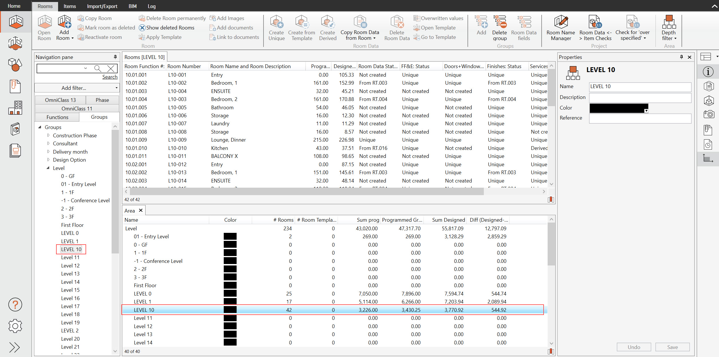 プロジェクトプロパティパネルで面積が有効になっているグループタイプごとに “プログラム総面積の合計” と “設計総面積の合計” を表示します。