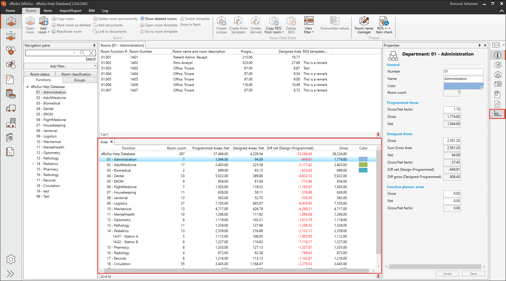 エリアパネルには、部屋モジュールの機能構造内の選択に関連するエリアの概要が表示されます。