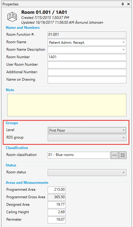 一度グループが作成されると、部屋のプロパティパネルに部屋グループが表示されます: