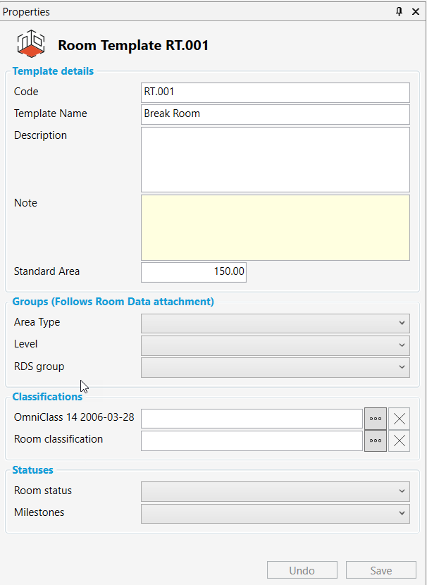このパネルは、選択されたエンティティ (部屋テンプレート、アイテムリストテンプレート等) に応じて、プロパティを表示します。部屋のグループ、分類、ステータスは全てプロパティパネルに表示されます。これらの値は、テンプレートに設定されている場合、部屋モジュールで部屋にテンプレートを割り当てると、部屋に継承されます。