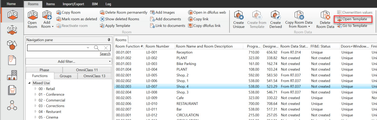 右クリックし、" 部屋データ" と "テンプレートを開く(Room Data)" を選択します。