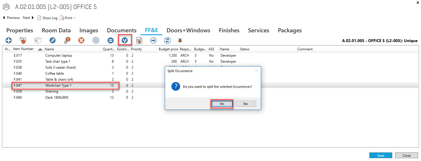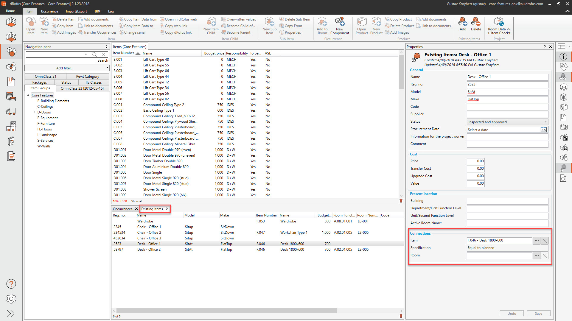 既存アイテムの移動先の部屋をダブルクリックして部屋を開き、関連アイテムリストで個々のアイテムのオカレンスを見つけます。