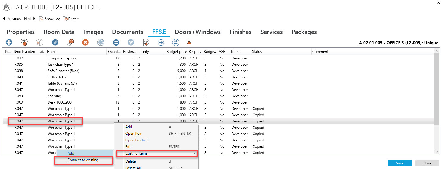 部屋のアイテムリストでアイテムを右クリックすると、"追加 "または " 既存のアイテムに接続" のオプションが表示されます。