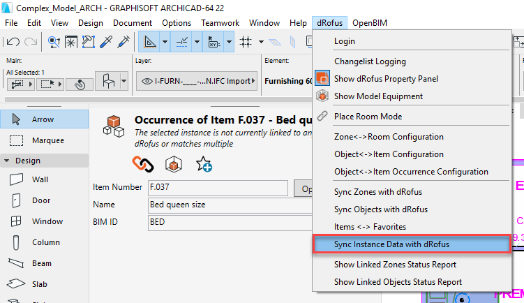 ArchiCADオブジェクトとdRofusアイテムオカレンス間のデータを同期するには、dRofusメニューのインスタンスデータをdRofusと同期を選択します: