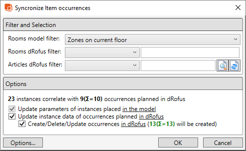 アイテムオカレンスの同期ダイアログパネルは、ArchiCADのゾーンに配置されたオブジェクトとdRofusの部屋に計画されたアイテムを比較し、選択されたオブジェクトに対して同期を実行するとどうなるかを表示します。