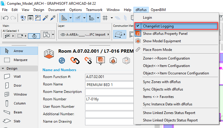 この機能を有効にするには、ArchiCADアドオン内でdRofusにログインした後、変更履歴(Changelist Logging) の記録 (下図参照)を選択します: