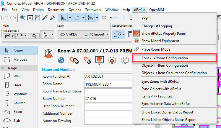 dRofusにデータを書き込む: dRofus 属性を選択し、ArchiCADパラメーターを選択して "リンク<--(Link <--)"をクリックします。次回構成をリンクまたは同期に使用する場合、データフローの方向はArchiCADからdRofusになります。- つまりゾーンの値になります' 選択されたArchiCADパラメータは、部屋が選択したdRofus属性に書き込まれます。