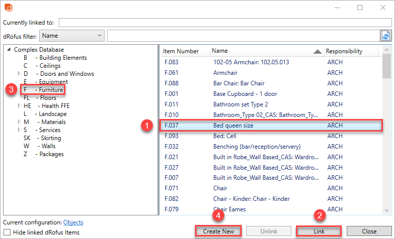 - (3) & (4) - 参照, 新規作成 + リンクで、アイテムグループ構造内に新しいdRofusアイテムを作成し選択したArchiCADオブジェクトとリンクします: