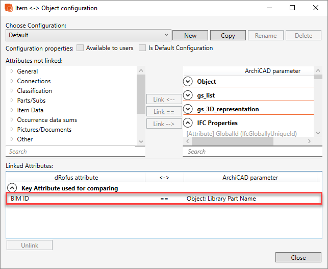 ArchiCADオブジェクトをdRofusアイテムにリンクするには、アドオン内で、選択したdRofus属性とArchiCADパラメータを比較に使用するキー属性として、オブジェクト<->アイテム構成(Object <-> Item Configuration )を設定する必要があります。以下の例では、dRofusのBIM IDとArchiCADのライブラリパーツ名を比較のキー属性として使用しています: