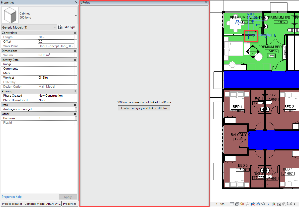 もし (その一方で) Revitファミリインスタンス (ファミリタイプが対応するdRofusアイテムタイプにまだリンクされていない)を選択すると、dRofusパネルに以下のメッセージが表示され、ここから以下のようにカテゴリーを有効にしdRofusにリンクすることができます:
