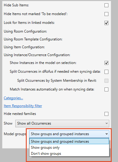 “モデルグループ”は、Revitファミリーのカテゴリフィルターとして含めることができ、以下のようにdRofusアイテムにリンクさせることができます;