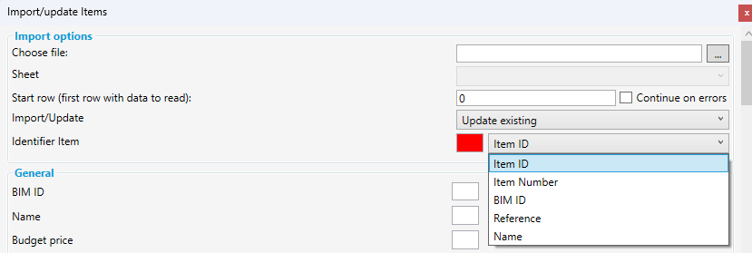 Excel ファイルを更新に使用する場合、ファイルには識別子が含まれている必要があります。識別子として使用できる値は、インポートとアップデートのウィンドウで表示および選択できます。以下は、アイテムを更新するための識別子の例です。