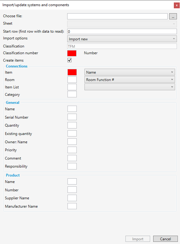 システムおよびコンポーネントをインポート、または更新するには、関連データがあらかじめ入力されたExcelスプレッドシートが必要です。Excelシートには分類番号とアイテム名が、