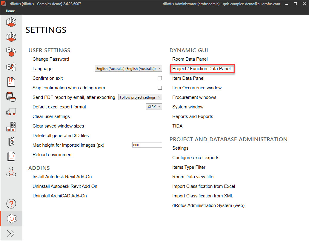 "Project / Function Data Panel (プロジェクト/機能データパネル)" 動的 GUI は、Settings (設定) →