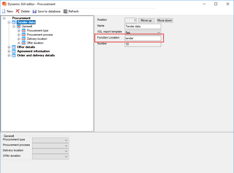 ロケーションは、作成したフラグの機能ロケーション属性に挿入した名前によって決定されます。1 つのフラグは、調達モジュールの 1 つのタブになります。