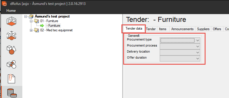 上の画像では、調達モジュールの入札レベルに表示させたいフラグ “Tender data (入札データ)” を作成しています。次に、”tender (入札)”という値を入力し、