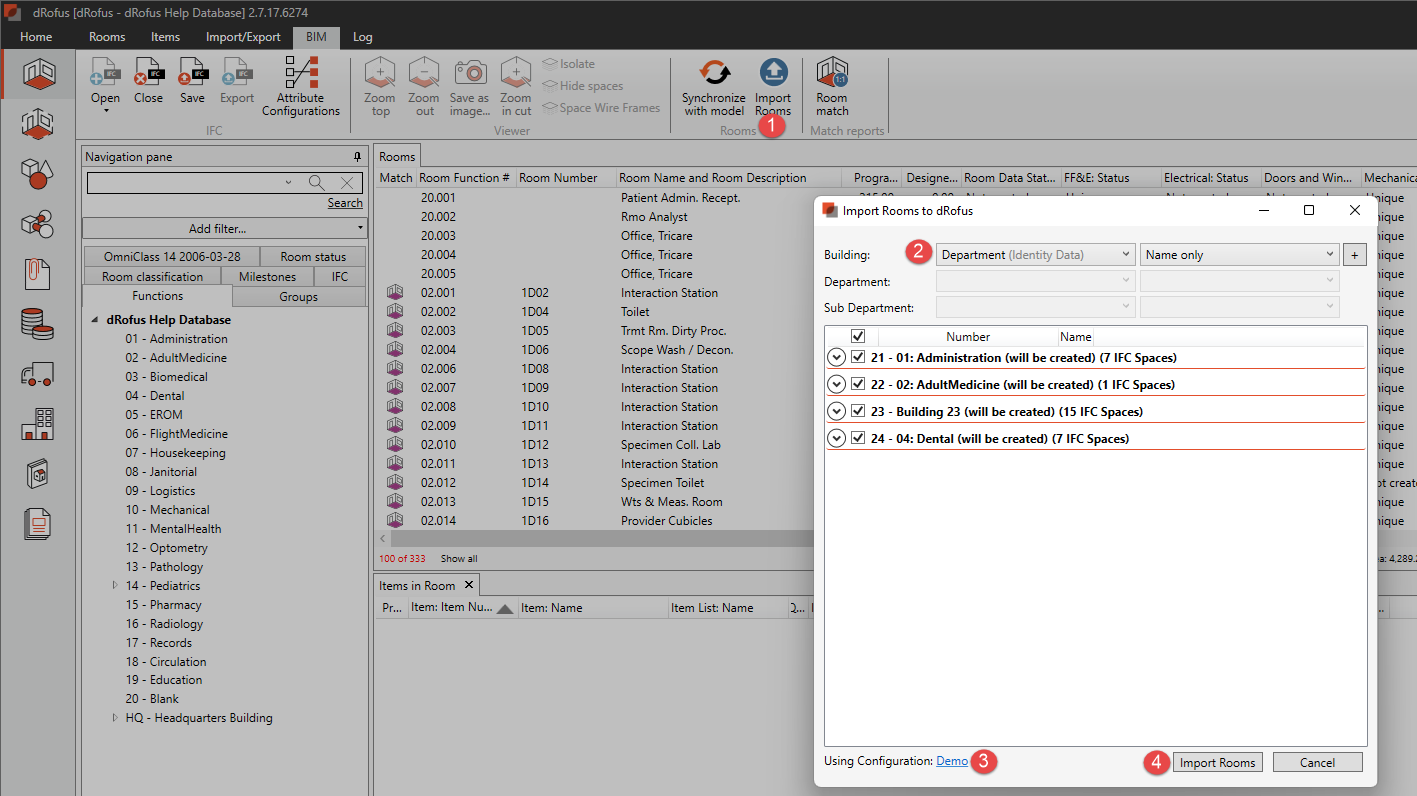 dRofusで機能構造を作成するために使用するIFCプロパティを選択します。