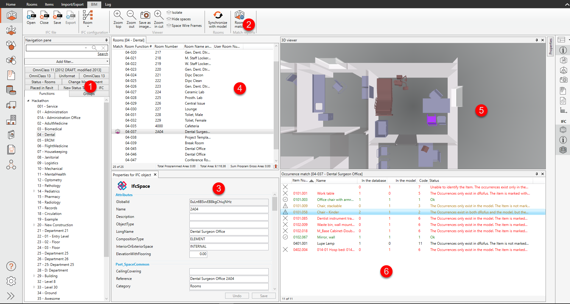 このリストには、部屋プログラム(dRofus)とモデルの両方、モデルのみ、dRofusのみの部屋を表示することができます:3Dビューイング・ウィンドウ。