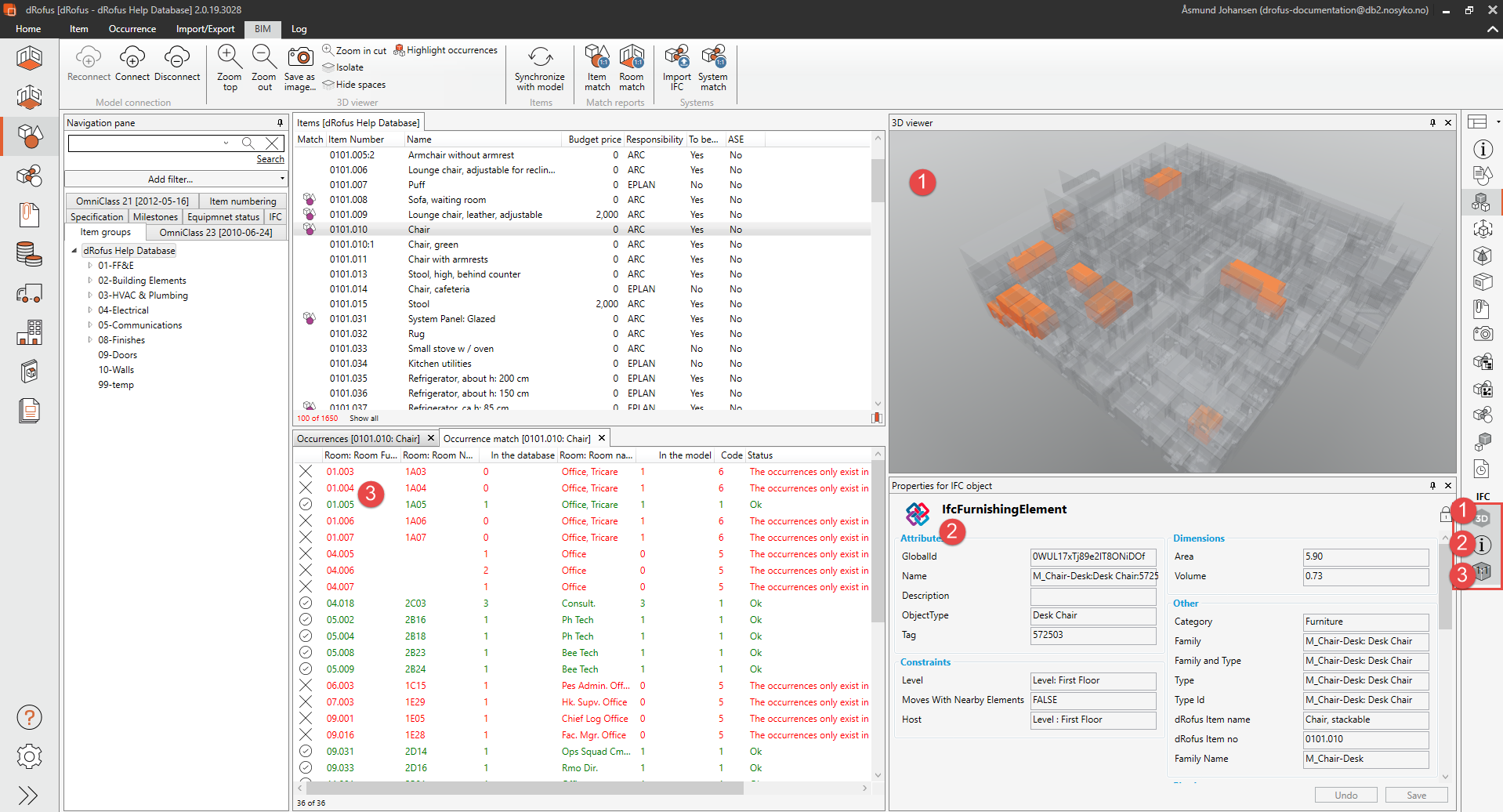 オカレンスの一致: dRofusとIFCモデルのオカレンスの比較を表示します。