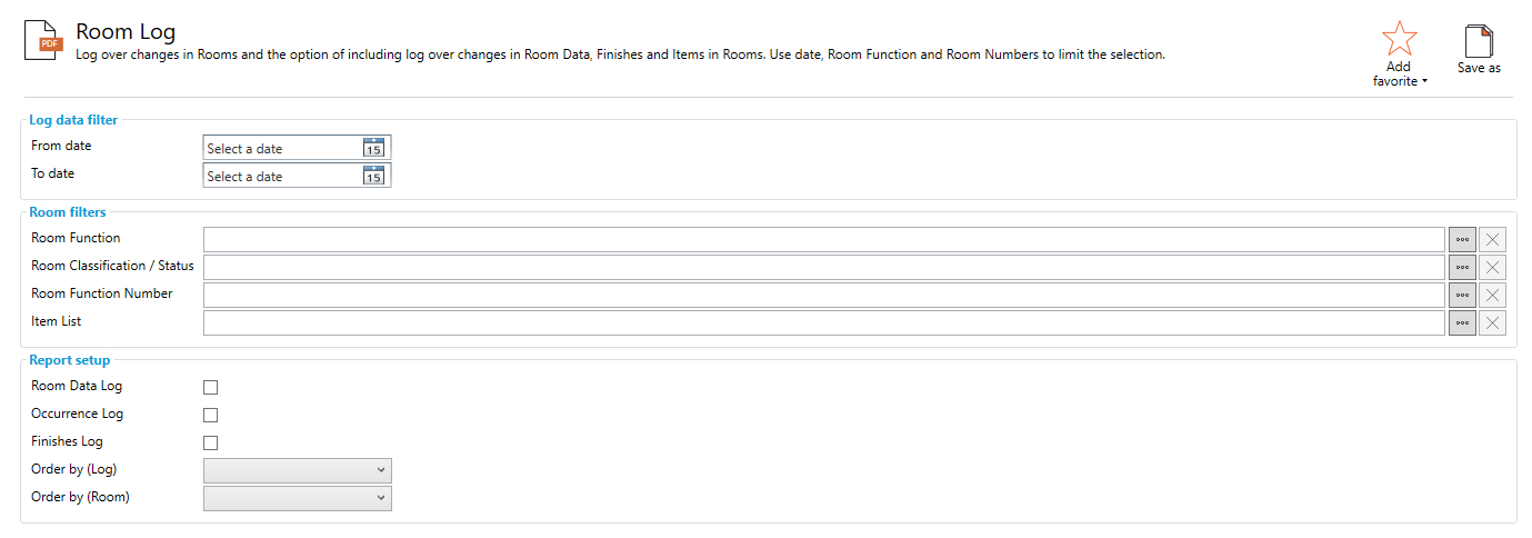 このレポートは、部屋のログデータの変更を表示し、部屋データと部屋のアイテムのログの変更を含めるオプションがあります。