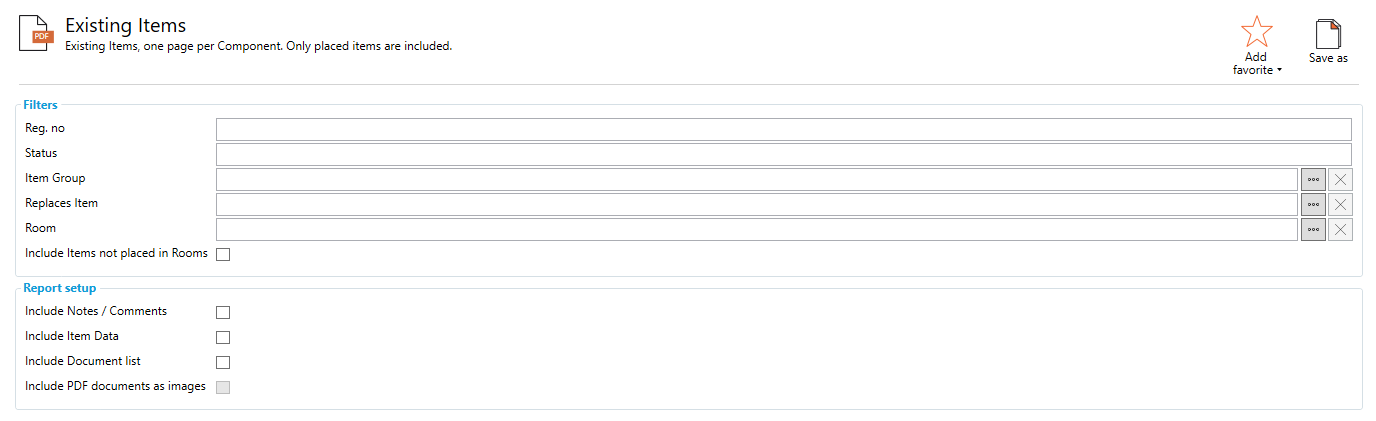 部屋に配置されていないアイテムを含める: チェックを入れると、このレポートには部屋に配置されていないアイテムが含まれます。